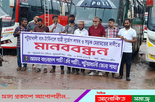 পটুয়াখালী বাস টার্মিনালে যাত্রী দুর্ভোগ লাঘব ও রাস্তা মেরামতের দাবীতে এবিপার্টির মানববন্ধন